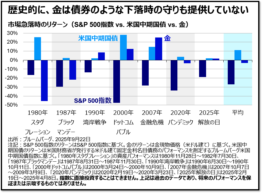市場急落時において、歴史的に金は、米国中期国債ほど優れた下落時の守り(ダウンサイドプロテクション)を提供してきませんでした。